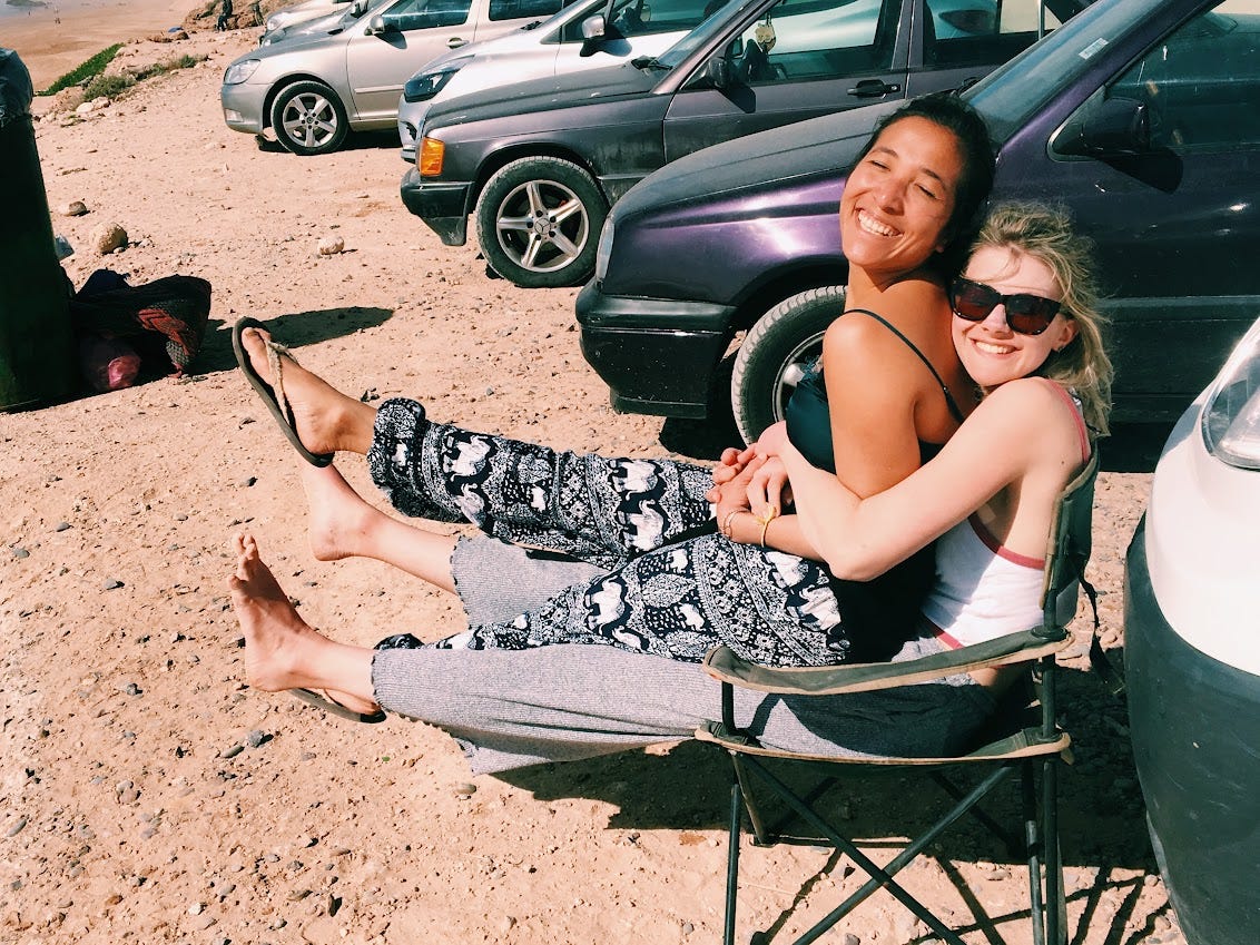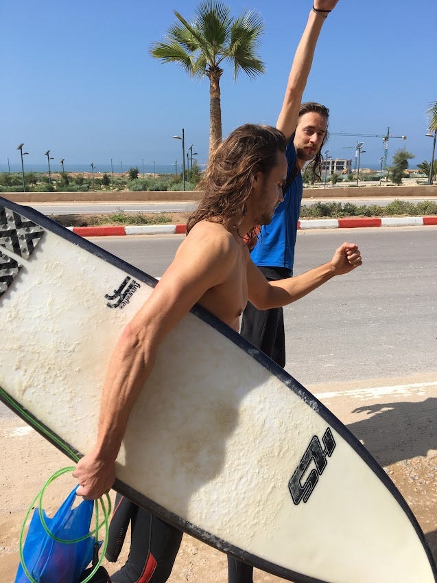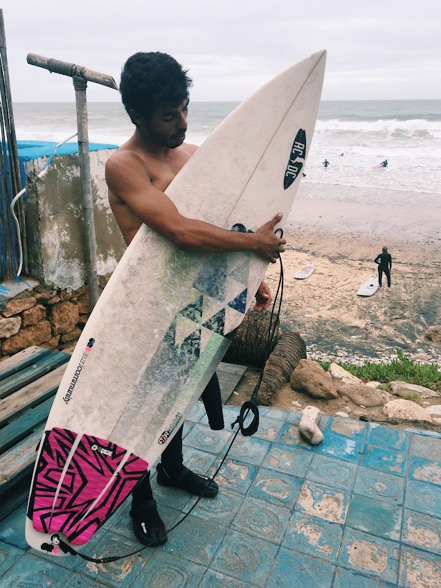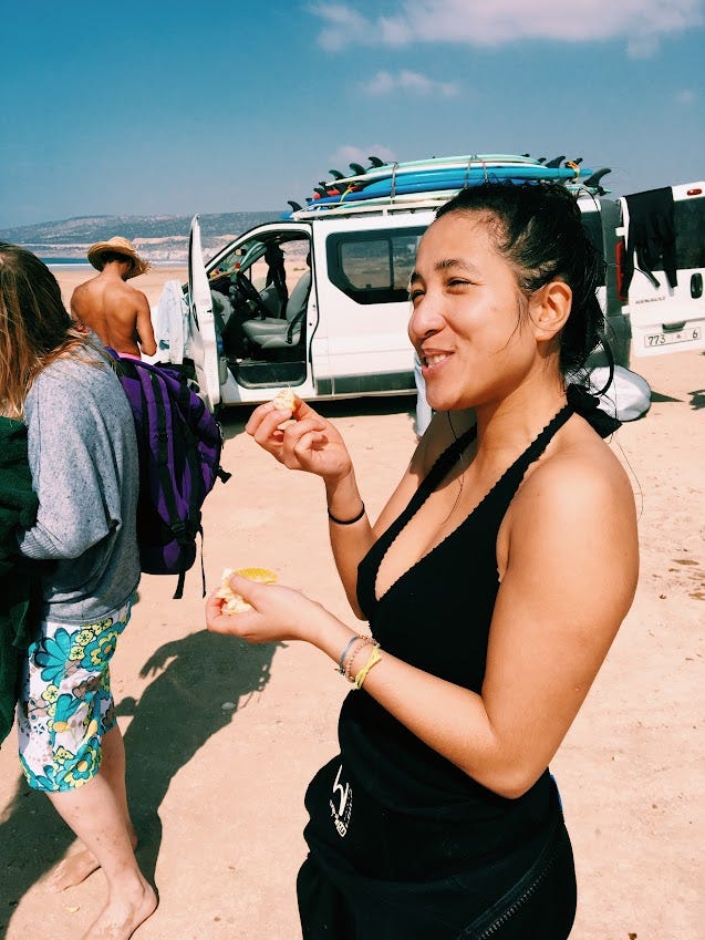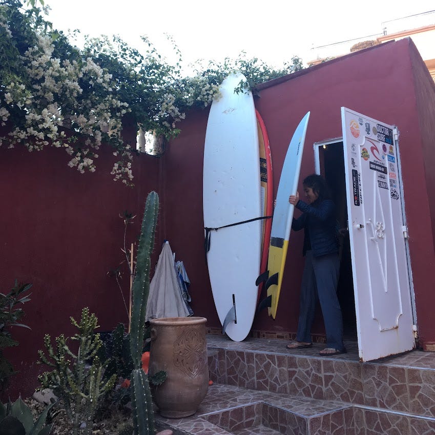 I spent a month and a half in Morocco in 2018. This was an incredibly special time – it was where I first really learned to surf. Thinking about this trip still brings me so much joy. I was in my last year medical school, and on the day that I flew out from Boston, there was still snow on the ground. I had some semblance of a plan – first spend a week in surf camp, then practice for the rest of my time there by myself. I couldn't have even imagined the people that I would meet.
