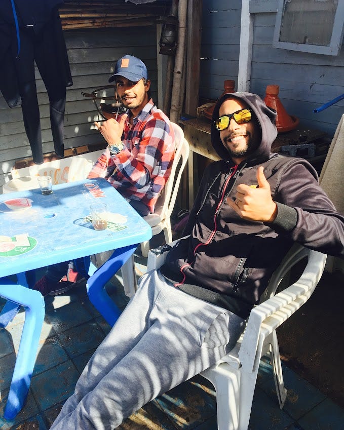 Afterwards I stayed in a hostel and went to one of the local surf shops at Tamraght beach. This is where I met other friends, including one who later also visited me in South Africa. We would gather on the patio of the surf shop, or when it rained we stayed inside and played music. One of the shop owners was named Tarik Elbassity, who is a championship Moroccan longboarder. Every day there were Moroccan surfers who also came by to say hi to the owners including Tarik.